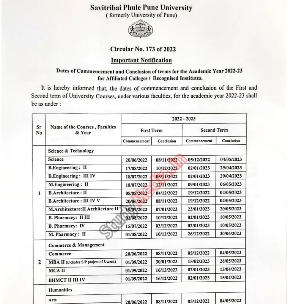 Academic Calender SPPU 2022